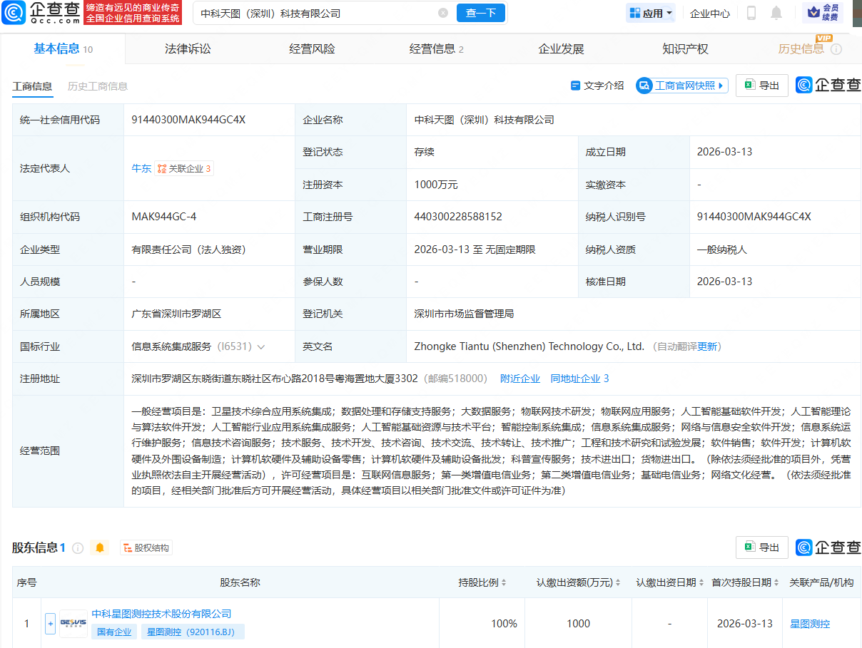 近日,中科天图(深圳)科技有限公司成立,法定代表人为牛东,注册资本为1000万元,经营范围包含:卫星技术综合应用系统集成;数据处理和存储支持服务;人工智能基础软件开发;人工智能理论与算法软件开发等。企查查股权穿透显示,该公司由星图测控(920116)全资持股。