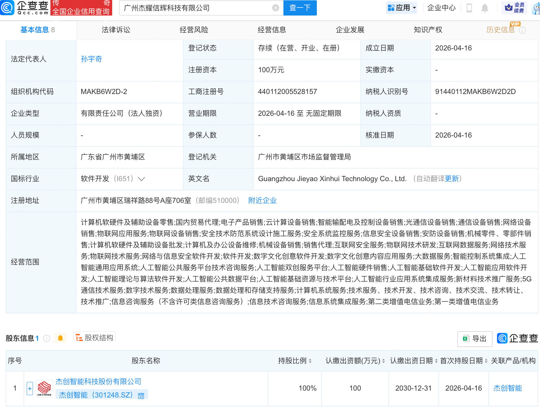近日,广州杰耀信辉科技有限公司成立,经营范围包含:人工智能基础软件开发;人工智能应用软件开发;人工智能理论与算法软件开发;人工智能公共数据平台等。企查查股权穿透显示,该公司由杰创智能(301248)全资持股。
